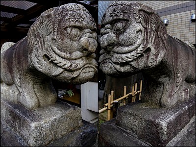 山門前には一対の狛犬ならぬ狛件がある。件(くだん)は半人半牛の日本の妖怪。