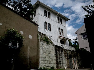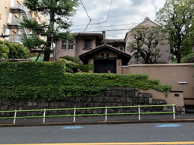 三菱電機高輪荘は、昭和初期築の主屋、蔵、洋館が国登録有形文化財。非公開で、背面がうかがえるのみ。