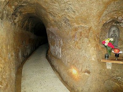 本堂内陣は1769年建立の土蔵造で国登録有形文化財。その外側は昭和3年に建造された石積外壁に覆われており、内陣を外から見る事はできない。