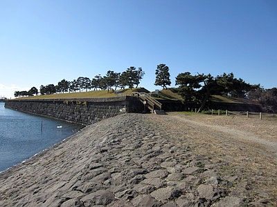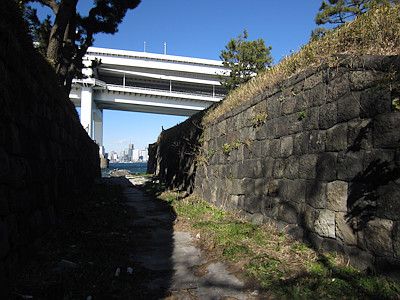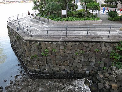品川区にある天王洲アイルのシーフォートスクエアは、品川第四台場を埋め立てて造成したエリアである。今でも水路に面した石垣があるが、これは台場の石垣を再利用して積み直したもの。