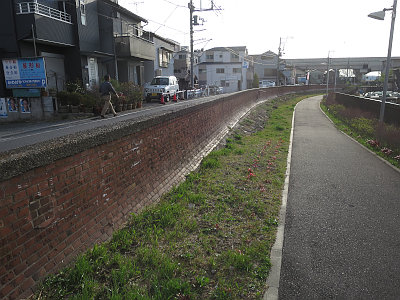 大師橋児童公園から仲東児童公園付近までにかけての約1km、大正7年に築造された煉瓦造の堤防が車道沿いに残る。