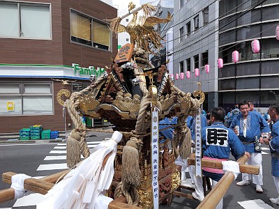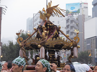 渋谷二丁目町会の大神輿は、通常のムクリ屋根の神輿に八棟造を組み合わせたような形状をしている。