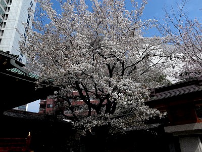 金王桜は長州緋桜という品種だとされ、一枝に一重と八重が混ざって咲くと言う。渋谷区指定天然記念物。