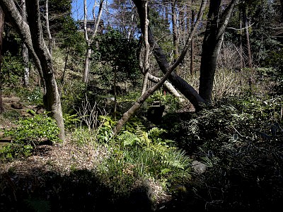 庭園は国分寺崖線の斜面を利用して整備され、竹林や小川もある。
