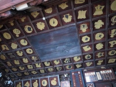 荒神堂の拝殿内には天井絵と絵馬群がある。荒神の神使は鶏であるため鶏の図案が多い。また拝殿の格天井には、火の安全を祈願して火消しが奉納した纏(まとい)の図案が施されている。