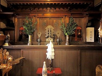 本殿は土蔵造で、その内扉には明治元年頃に作成された伊豆長八の鏝絵(漆喰彫刻)が残されている。