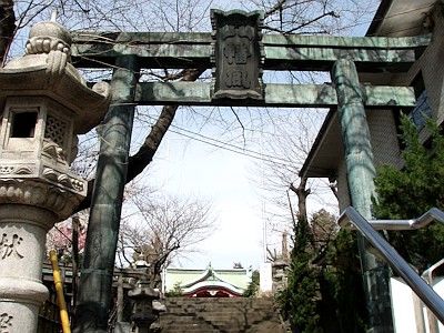 銅鳥居は江戸後期の1804年建立。新宿区指定有形文化財。