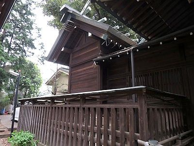 社殿は拝殿・幣殿・本殿を連結した権現造。本殿は昭和11年建立。切妻造で、さほど神明造風ではないが、鞭懸がある。