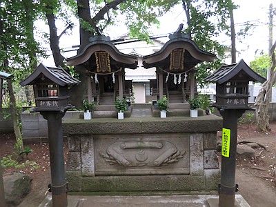 境内社の天満天神社と八雲神社は若干変則的な形状の小祠。また石造土台には巻物と宝珠の図案が彫られている。