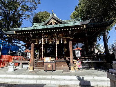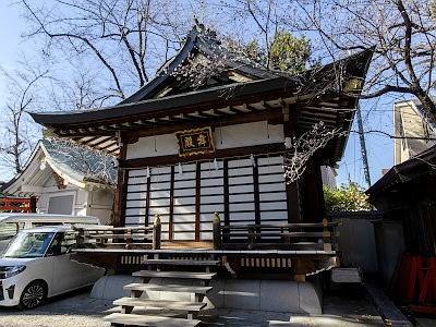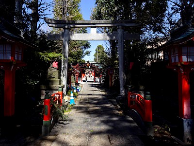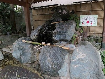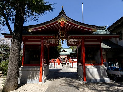東京の神社では比較的珍しい随神門があるほか、豪快な手水鉢や、東京三鳥居の一つと称する龍の彫刻が施された鳥居がある。