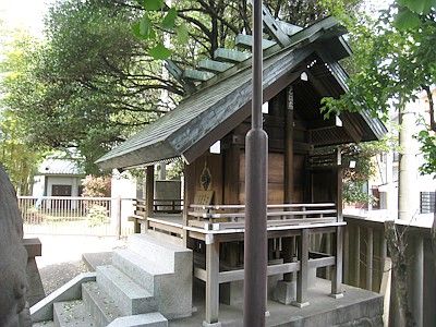 応神天皇・菅原道真・日本武尊を祀る境内社は変則的な形状。神明造だが、脇障子があり、また庇が前後で長さが異なるといった、流造に見られる要素が取り入れられている。