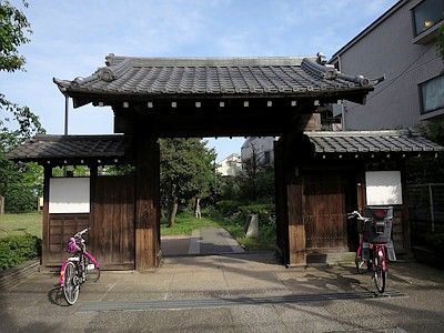腕木門は、染井通りをはさんで向かい側にあった津藩藩主藤堂家下屋敷(染井屋敷)の裏門を移築したと伝える。江戸後期の1847年以前の建立で豊島区指定有形文化財。津藩は三重県津市に藩庁を置いた藩。