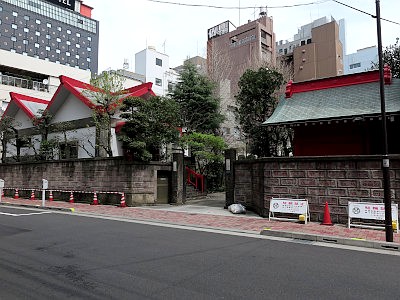 落語家の名が刻まれた外塀は昭和29年竣工。左の社殿は熊谷稲荷、西の社殿は吉見稲荷。