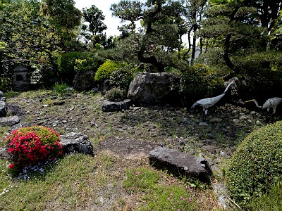 庭園には鶴の置物がある。