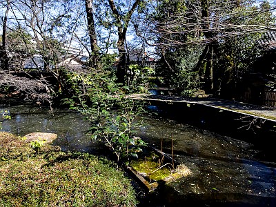観音堂は、RC造の八角堂で、池に立つ浮御堂。前に太鼓橋が架かる。