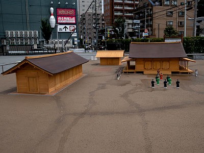 8世紀前半の主殿、脇殿、付属建物を1/10スケールで推定復元したもの。国司赴任時の儀式も人形で再現してある。
