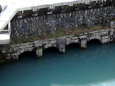 小吐口は余った水を多摩川に戻す口。明治33年、下部は石造、上部はゴロタ石積に改修された。