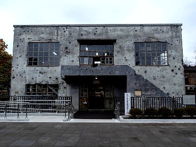 壁面には昭和20年の空襲で出来た機銃掃射や爆弾の破片の跡が無数に残る。