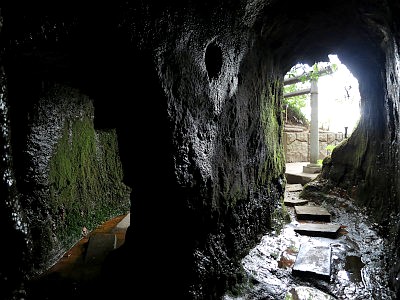 片方の洞窟の最奥には石祠があり、また二つの洞窟は奥でつながってもいる。