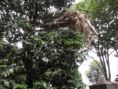 境内の木に掛かる「ふせぎ」は、村の入口に設置して病魔などの侵入を防ぐもの。
