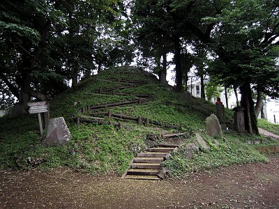 山頂には仙元大菩薩の石祠(1825年築造)と大日如来の石碑が立つ。