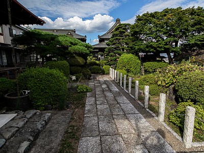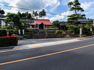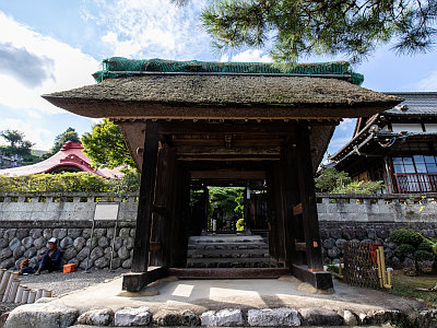 市の文化財に指定されている茅葺きの山門は、当地にあった豪族の居館の城門を移築したと伝える。
