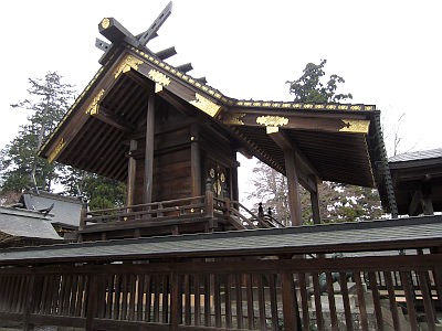本殿は明治11年建立。神明造だが長い向拝が付されている。