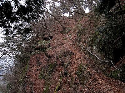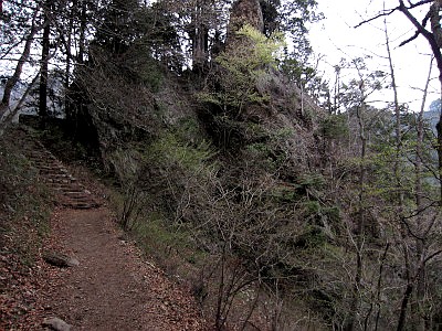 「七代の滝」の起点付近にある。天狗岩に登る鎖も整備されている。