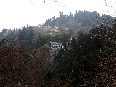 山上の駅方面から見た集落。武蔵御嶽神社は集落の奥に見える峰に鎮座する。なお、三ノ鳥居も駅の割と近くにある。