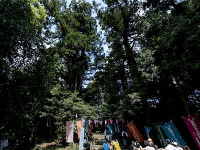 参道を挟む2本の大スギ(夫婦杉)は東京都指定天然記念物。
