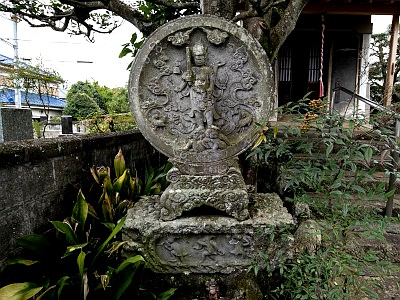 妙音堂の前にある庚申塔はあまり見かけないタイプ。